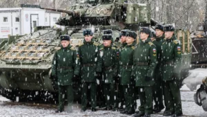 यूक्रेन में अमेरिकी एम-2 ब्रैडली लड़ाकू वाहन के पास रूसी सैनिकों को पकड़ लिया गया।
